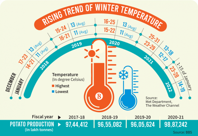 According to the Bangladesh Agro Meteorological Information Portal, cultivating potatoes requires 18-21 degrees Celsius of temperature from planting to maturity stages. Production is hampered when the temperature rises above 25 degrees Celsius and drops below 15 degrees Celsius. This time winter set in at least 15 days later than normal because of climate change and its intensity is less than that of the last few years. Data from 2018-20 show that the maximum temperature in December was within 25 degrees Celsius but in 2021, it rose to 31 degrees Celsius, according to the Meteorological Department and the Weather Channel.